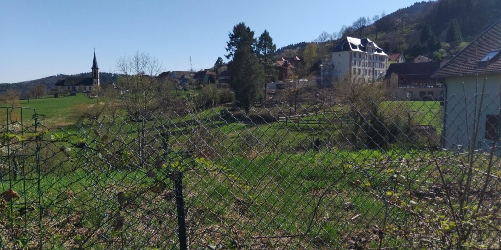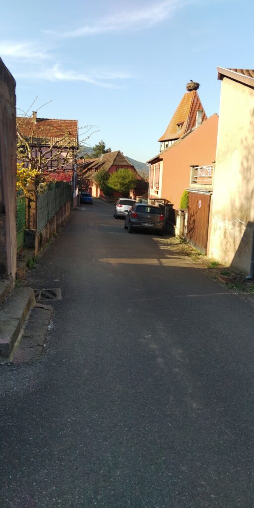 Ich will nicht den Umweg über das Dorf unten machen, dafür folgt erstmal ein kräftiger Aufstieg. Ich passiere wohl das Haus, das ich gestern für den Melkerhof gehalten habe, im Hintergrund Haut Koenigsbourg.