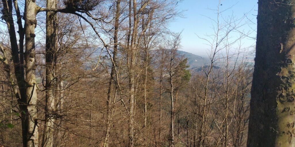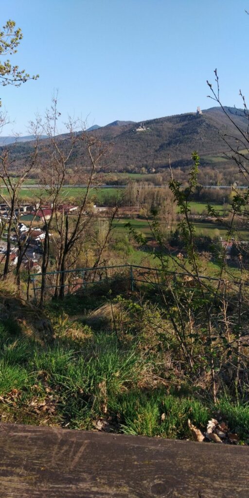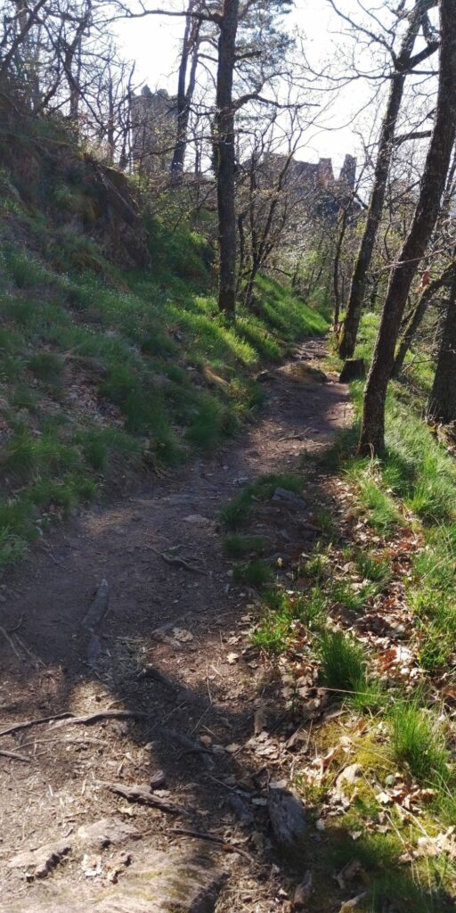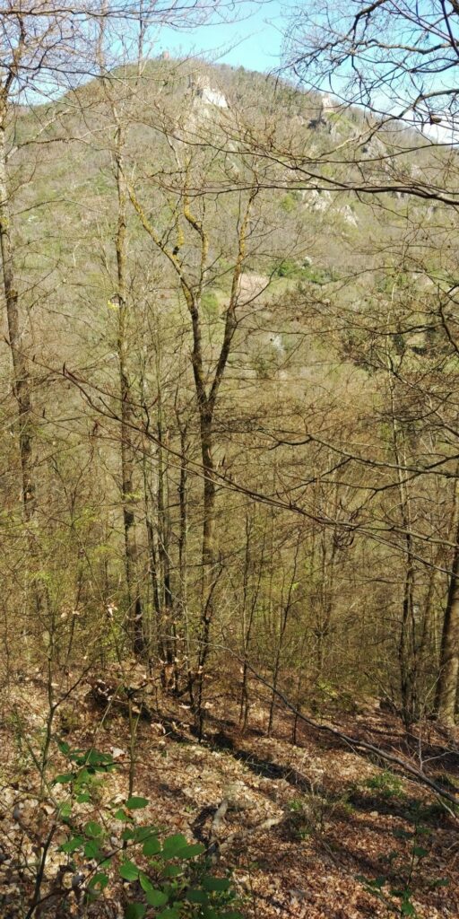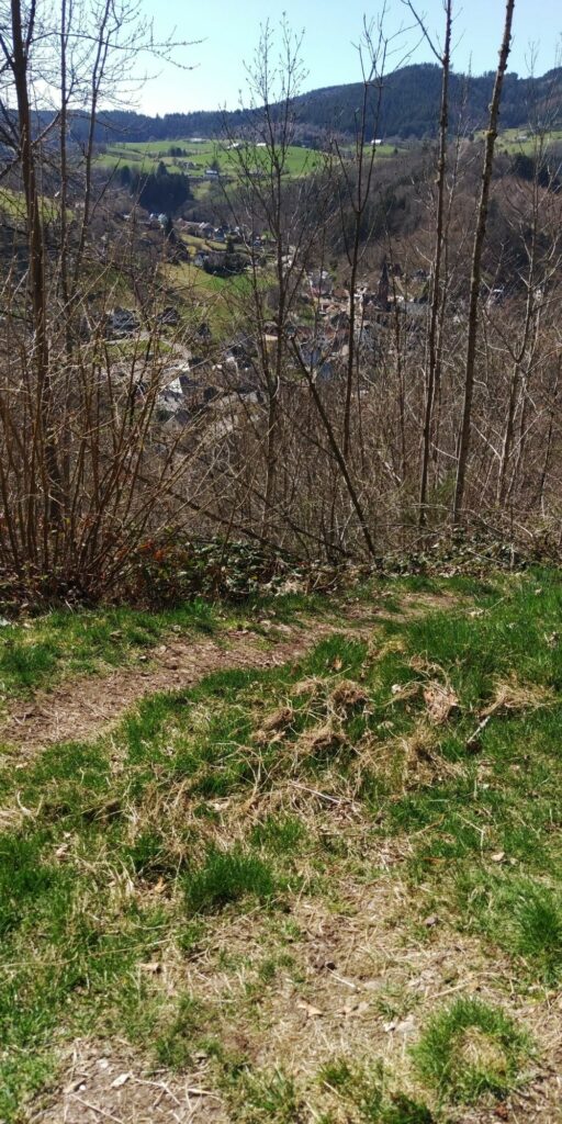 Der Aufstieg ist viel angenehmer als befürchtet, fast durchgehend „Single Trail“ mit gleichmäßiger Steigung schräg den Hang hinauf. Der Ort und die Burgen werden allmählich kleiner.
