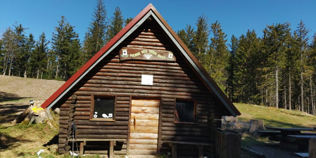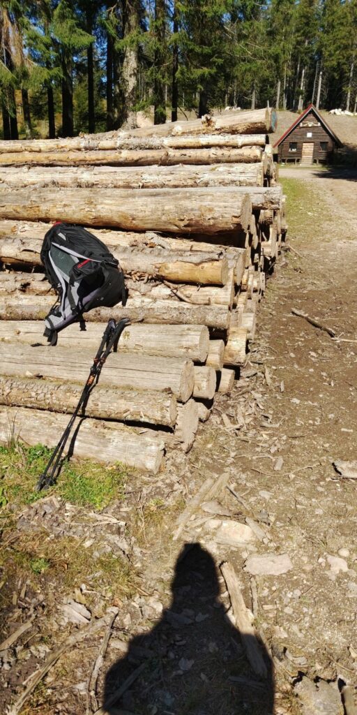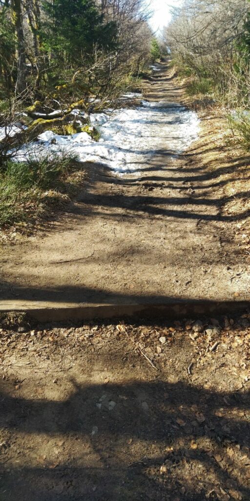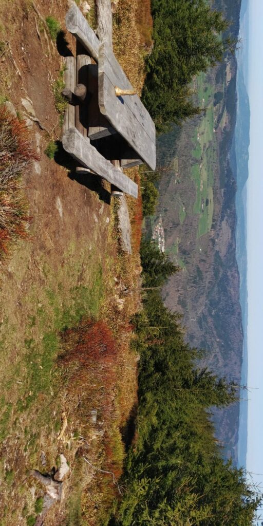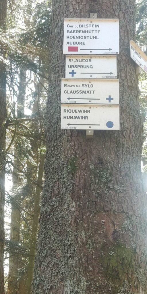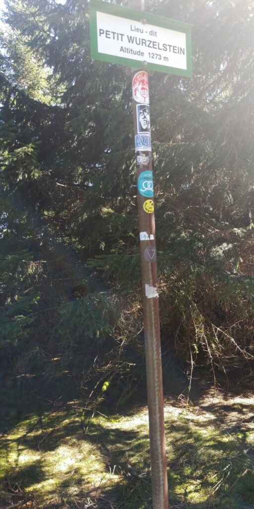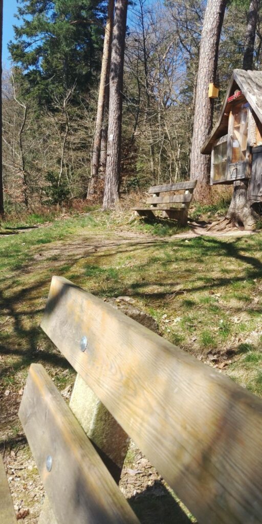 Ich stoße auf einen fünfeckigen Grenzstein (frz. Borne) und etwas später eine Picknick Zone mit diversen Bänken. Im Sommer ist der Schatten bestimmt toll, aber heute morgen um 10 hätte ich mir mehr Sonnenwärme gewünscht. 3 junge Leute kommen vorbei, die vor mir oben auf der Haut Koenigsbourg ankommen werden. Ein Ehepaar findet die schöne Sonnenbank am Beginn des ernsthaften Aufstiegs. Das zweite vorbeikommende Ehepaar überhole ich im Anstieg (Angeber ;))