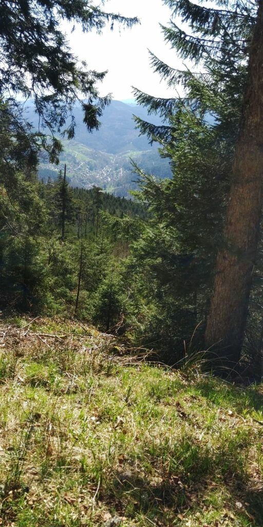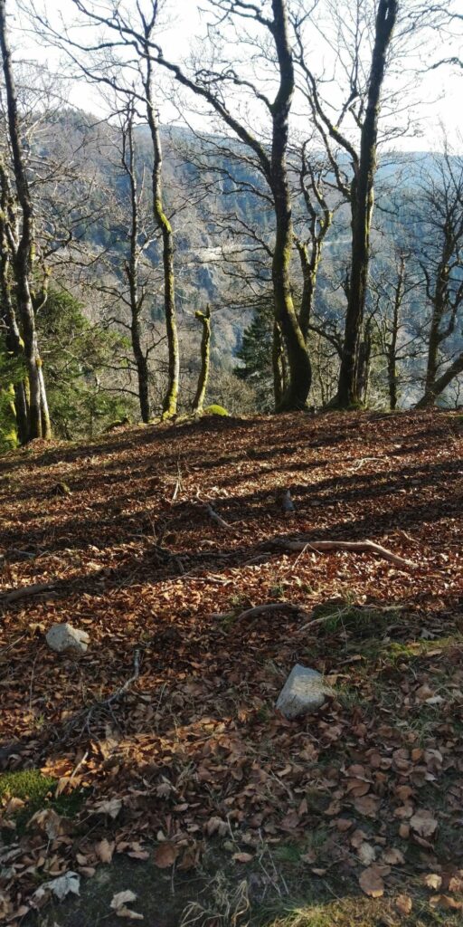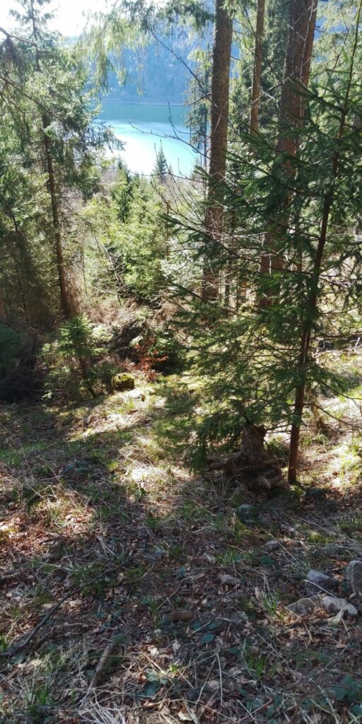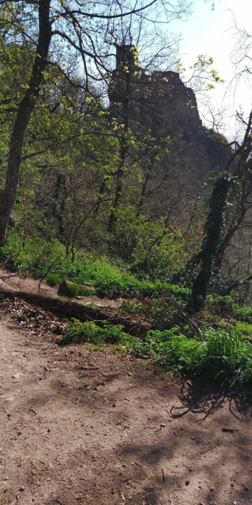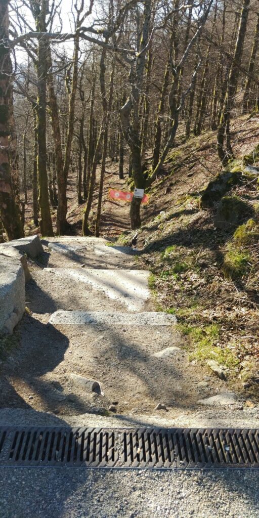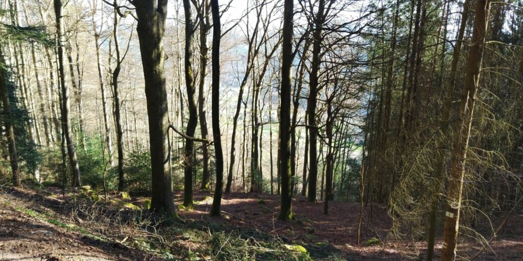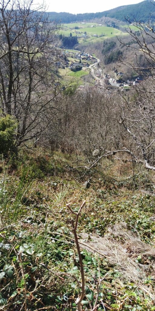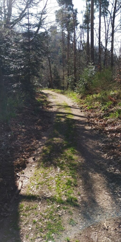 Kurz vor Erreichen des Waldes fand ich eine Narzisse. Allerdings habe ich dann gesehen dass auf der Weide viele Narzissen wuchsen. Im Wald ging es auf Serpentinen so steil bergab, das Komoot manchmal wähnte, ich sei in der falschen Richtung unterwegs.