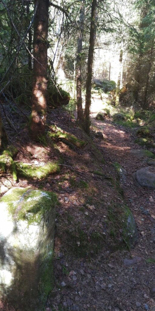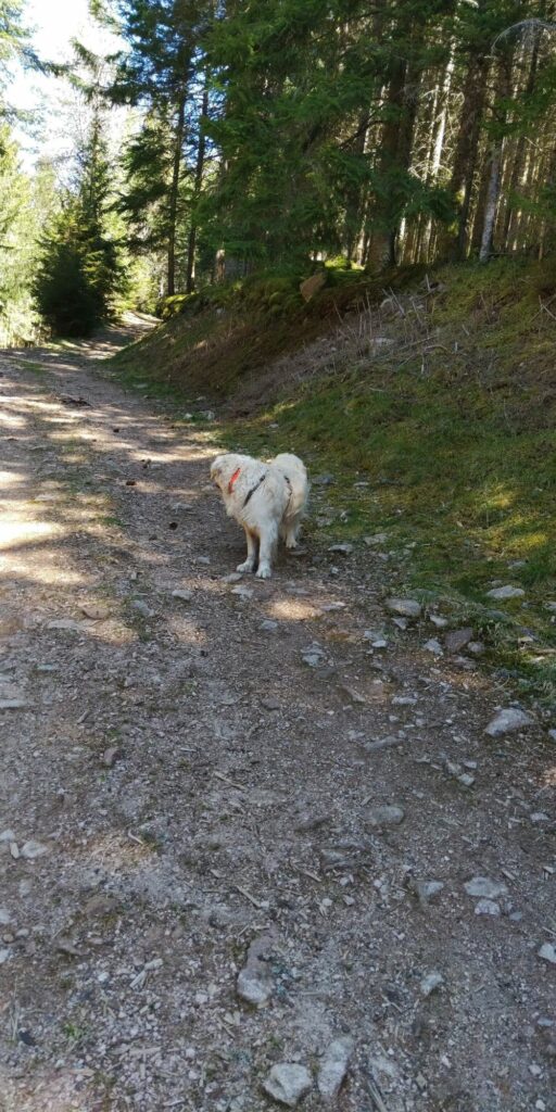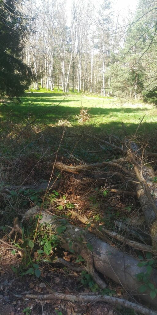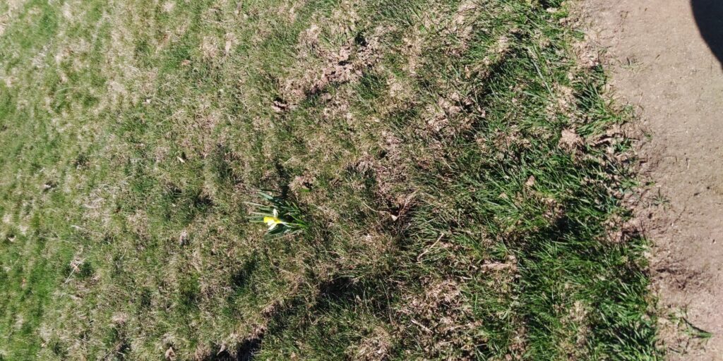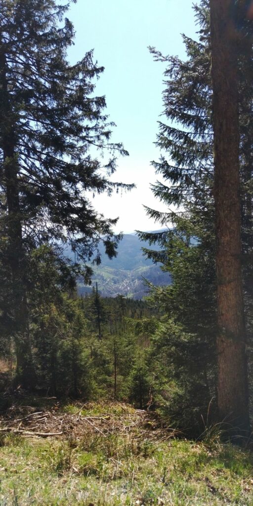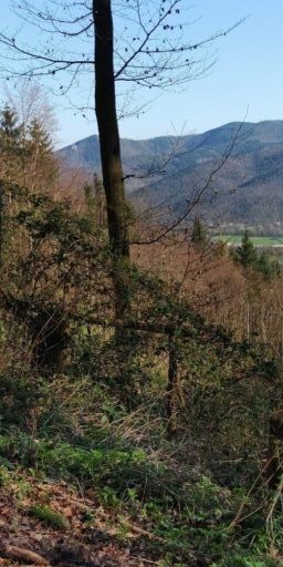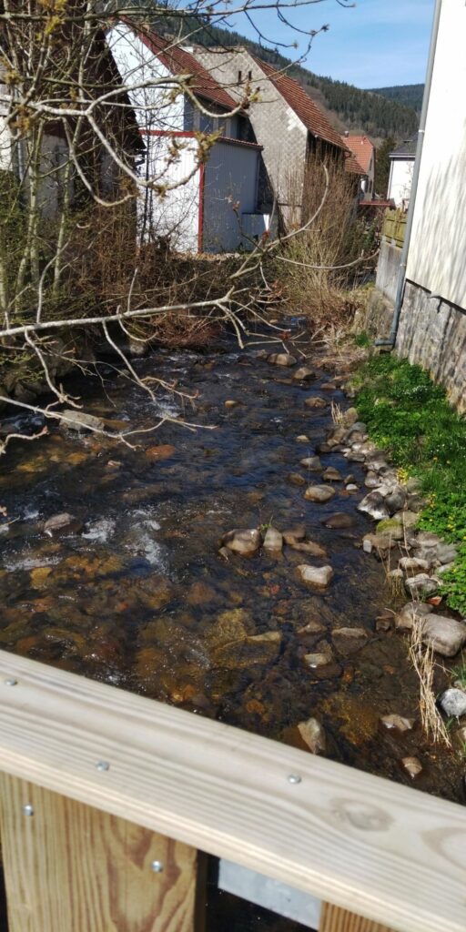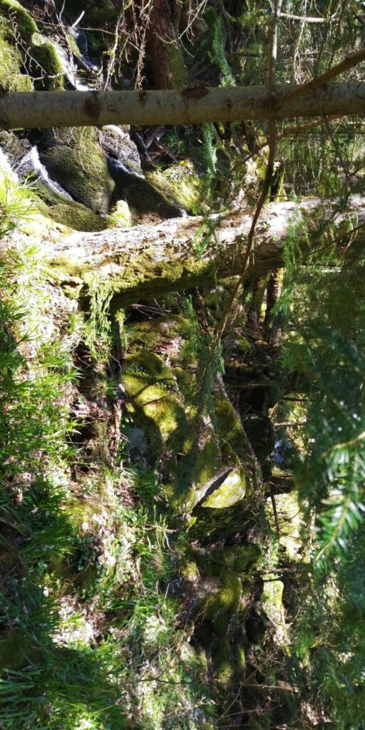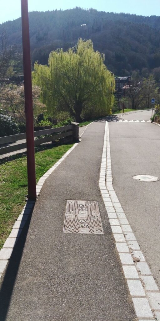 Kurz vor Erreichen des Waldes fand ich eine Narzisse. Allerdings habe ich dann gesehen dass auf der Weide viele Narzissen wuchsen. Im Wald ging es auf Serpentinen so steil bergab, das Komoot manchmal wähnte, ich sei in der falschen Richtung unterwegs.