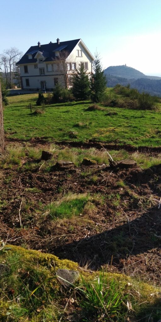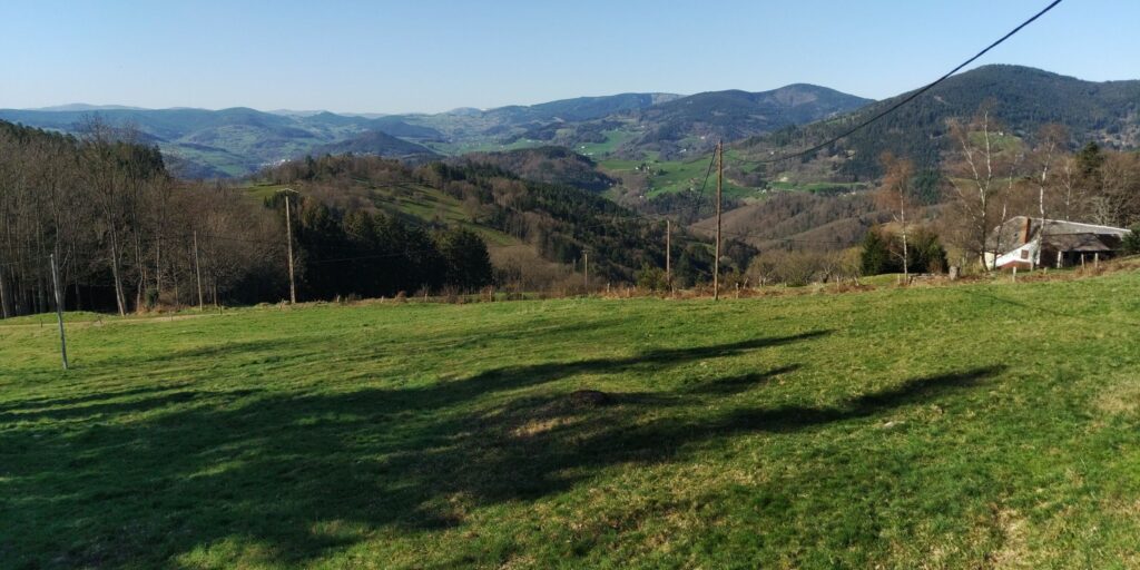 Schließlich komme ich in den Talkessel mit Fréland. Hier liegen fast kitschig verstreut Almen mit Berghöfen und Wochenendhäuser. Um 10 nach 5 erreiche ich meine Herberge, der Schlüssel ist wie beschrieben im Schlüsselkasten und schließlich kriege ich die Tür auch auf, dänisches Prinzip, Griff nach oben drehen und dann schließen oder so. Ich esse die letzten Vorräte aus Ludwigshafen (Bahnhofsbäcker) und Ribeauvillé, zum Nachtisch eine halbe Tafel Schokolade aus der Speisekammer und bin nun satt. Die Eltern des Wirts (wohnen wohl unten oder sonst wie in der Nähe) werden um 8 das Frühstück bringen. Bis dahin werde ich ausgeschlafen haben.