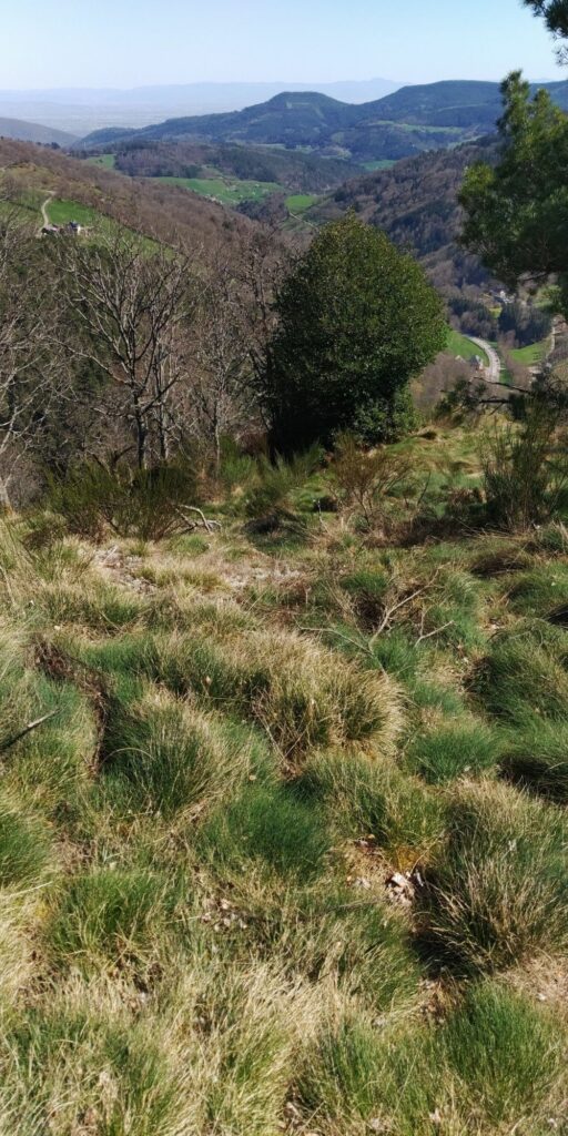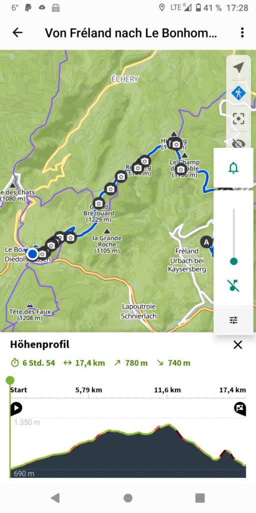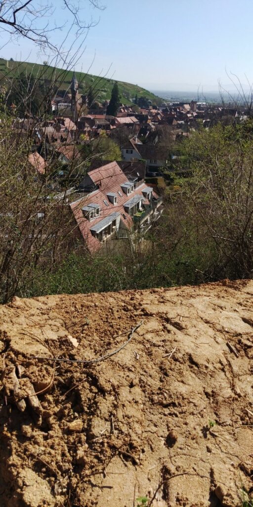 Ich höre hier auch schon die ersten Stimmen von anderen Wanderern, am Ulrichstein wird es richtig voll. Der Abstieg ist beschwerlich, voller toller Ausblicke und halb Ribeauvillé kommt mir entgegen. Einen Jogger mit leichtem Gepäck überholt mich halsbrecherisch bergab.