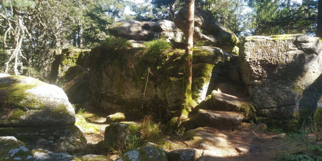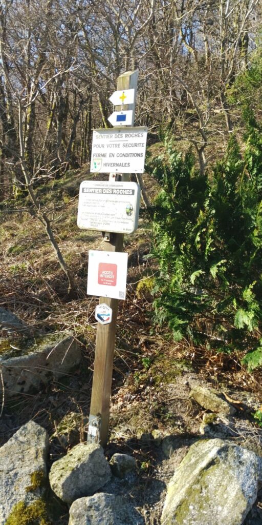 Schließlich mache ich meine letzte Rast bei einer schönen Sonnenbank und einen großen Felsen. Später erkenne ich an den Schildern dass der große Felsen der Namensgeber für die Runde ist: Circuit de château.