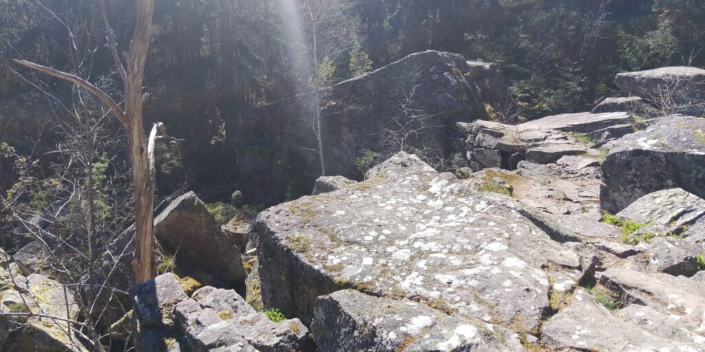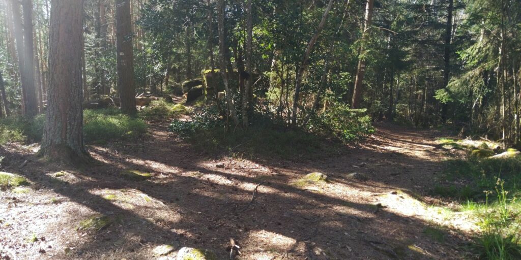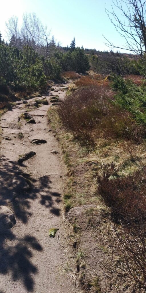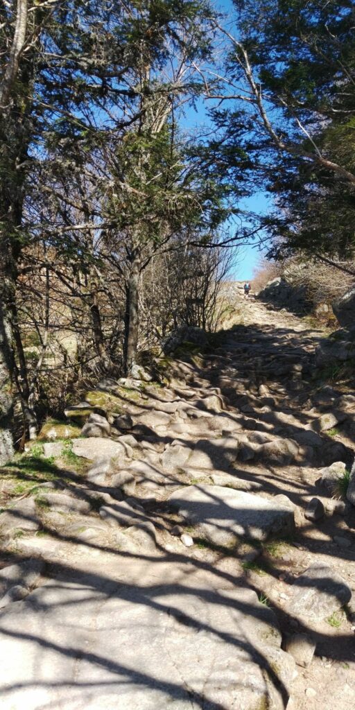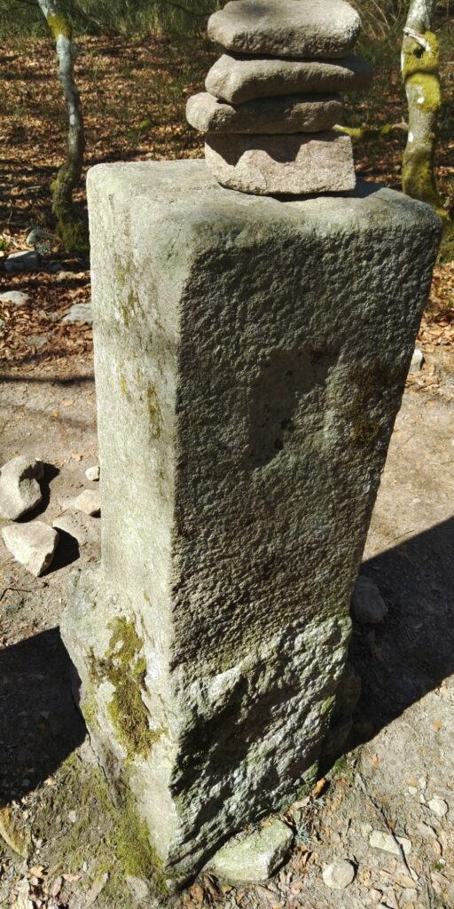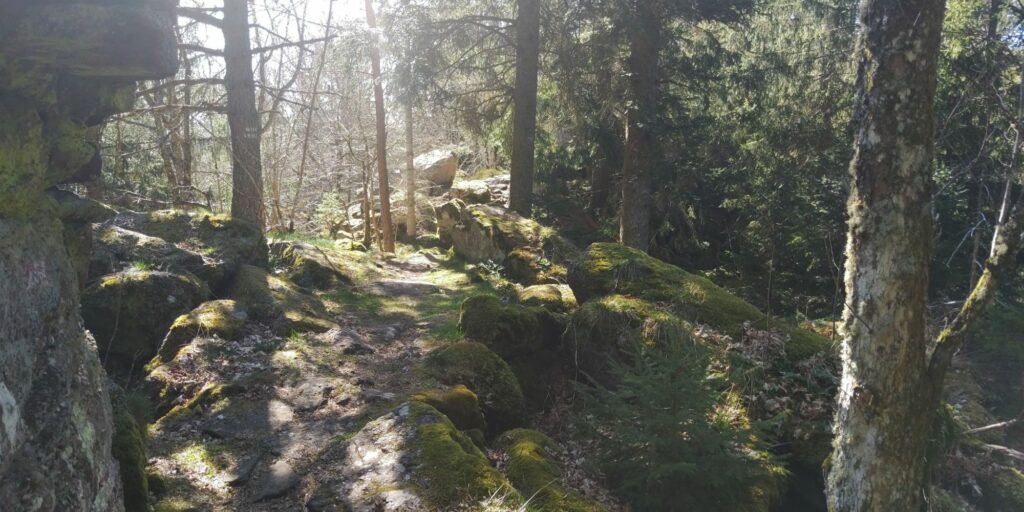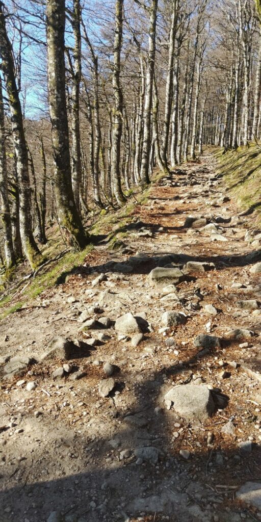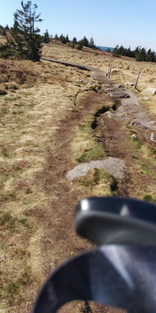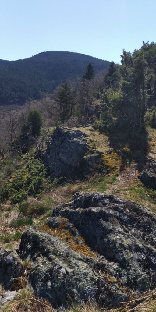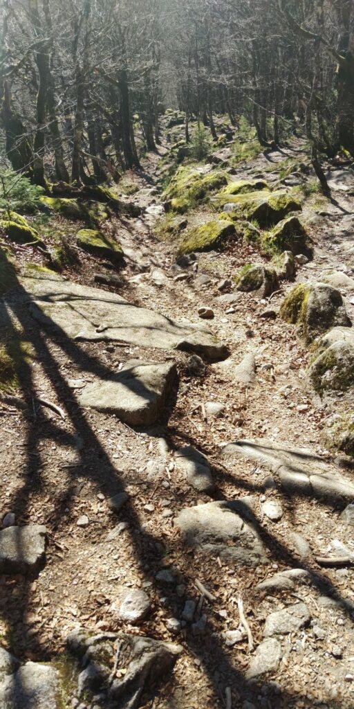 Die Landschaft oben ist für mich eine Mischung aus Lüneburger Heide, Nordsee-Krüppelkiefern, gefährlichen Abhängen und herrlichen Sichten. Und ständig Felsen und Steine. Auch Grenzsteine mit F und D, besonders gegen Ende waren die Ds unkenntlich gemacht. Überhaupt glaube ich, dass wir die Existenz dieses Weges dem alten Grenzkontrollweg verdanken.