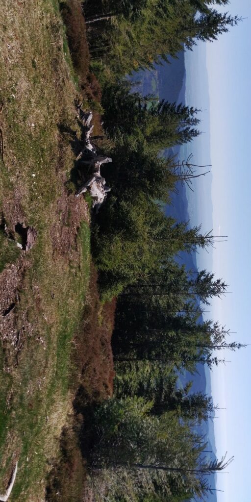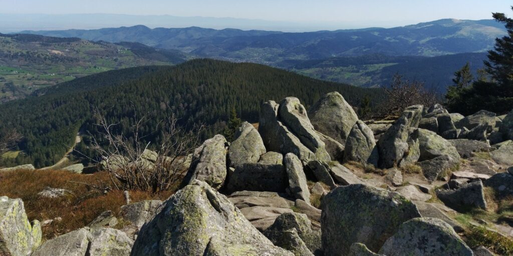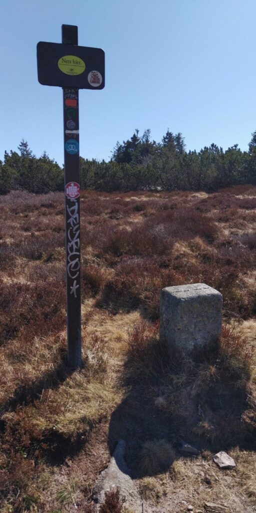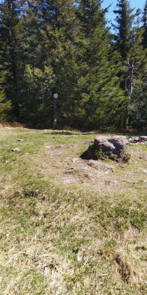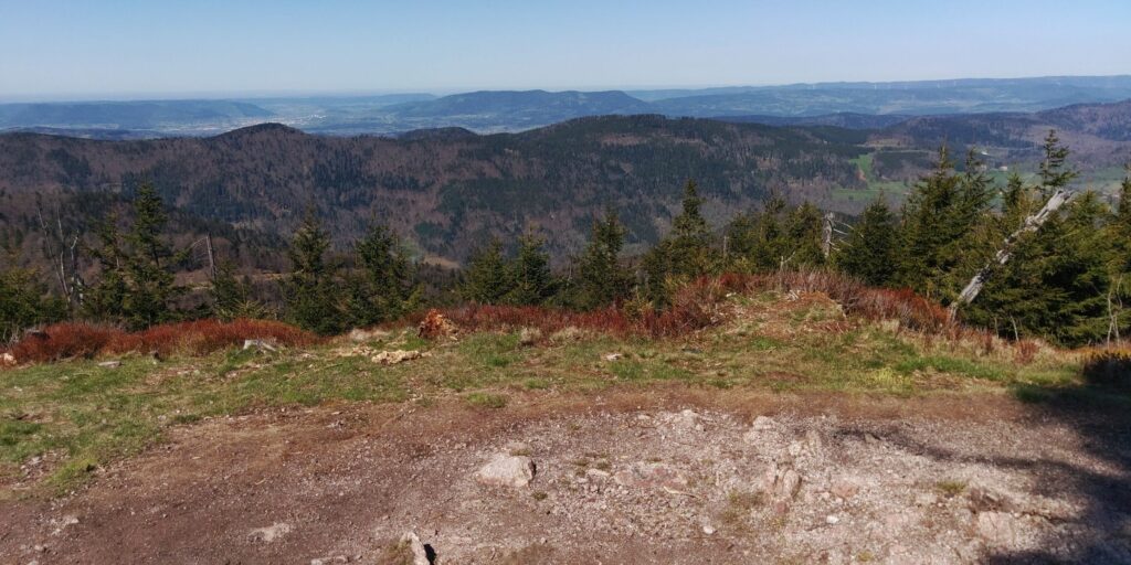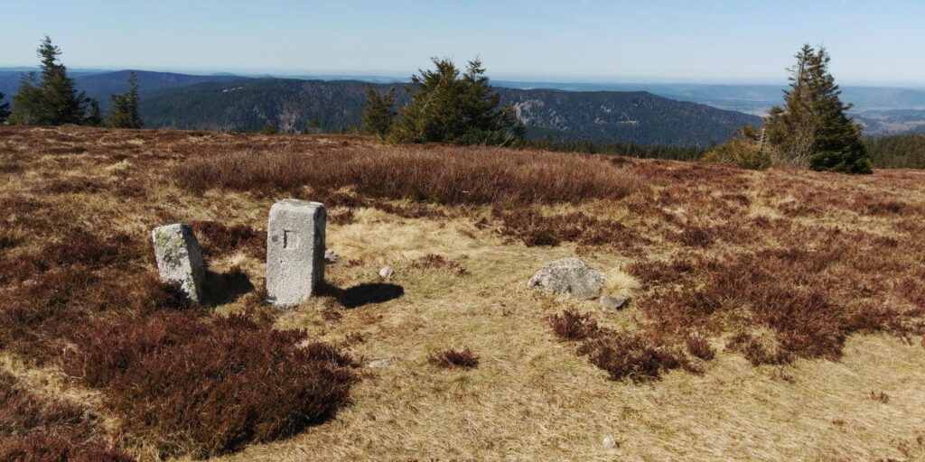 Oben gibt es nicht nur Aussichten sondern auch wieder Grenzsteine. War ja mal die Grenze zwischen Deutschland und Frankreich? Ich fühle mich auch stark genug und es ist auch früh genug, so dass ich doch über die beiden Brézouard-Gipfel gehe statt sie zu umgehen. Hier ist ordentlich was los: es wird gegrillt und ich sehe einen Hund auch zum ersten Mal. Den Hund treffe ich später beim Abstieg noch einmal, er möchte mich gerne in seinen „Rudel“ integrieren…