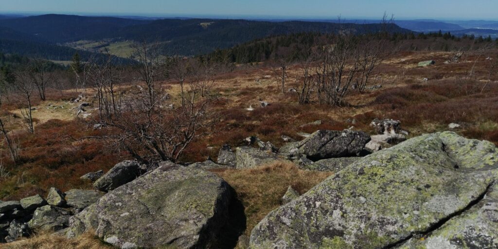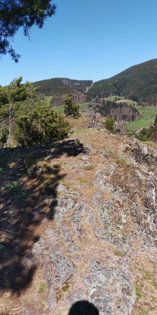 Bei den drei Bannfelsen glaube ich den höchsten Punkt erreicht zu haben und mache eine Rast. Der Hirzberg-Gipfel ist nicht weit und bietet eine schöne Aussicht Richtung Lothringen.