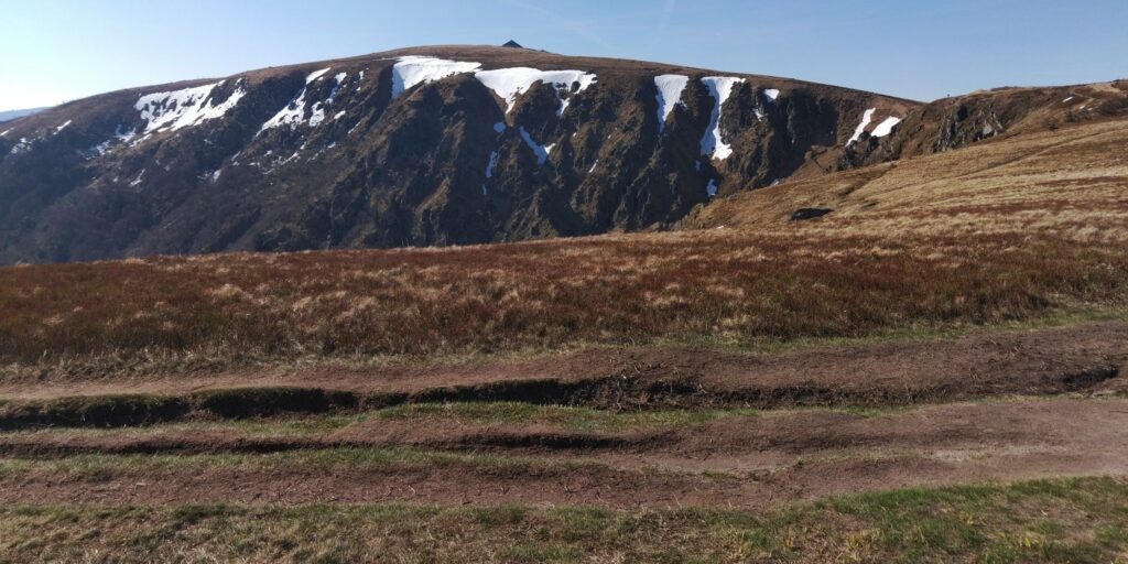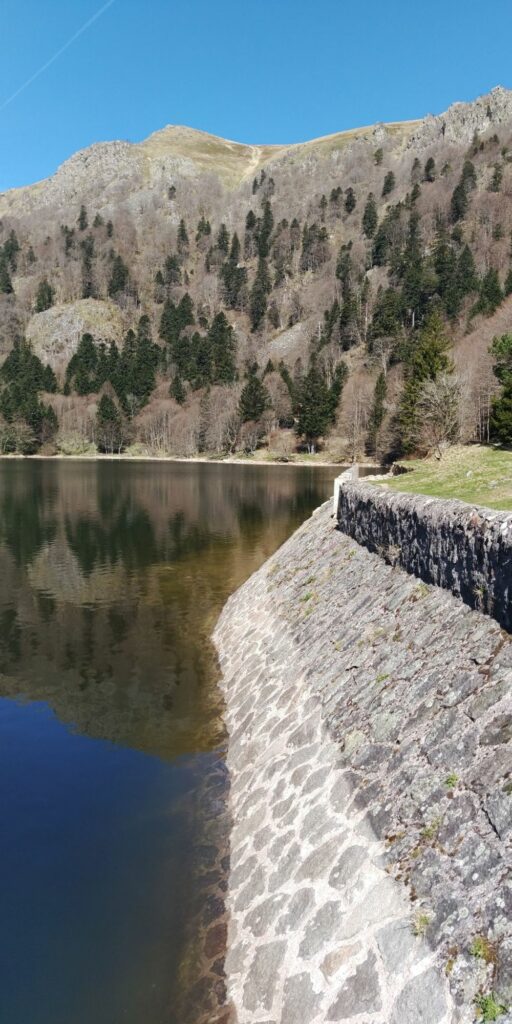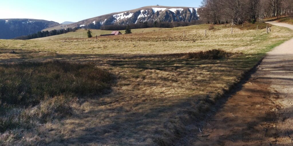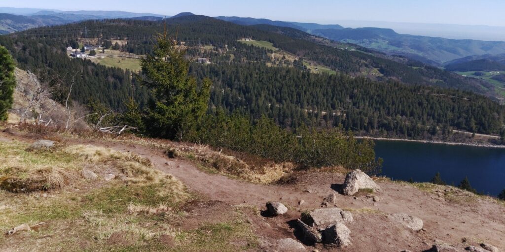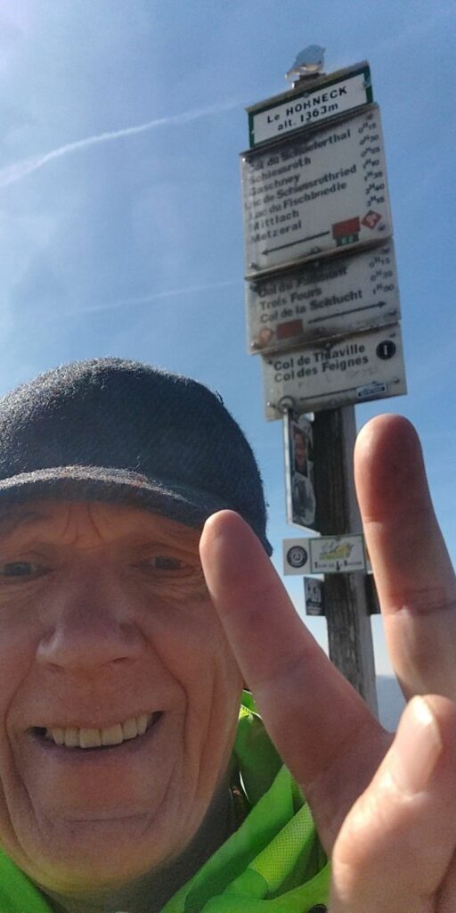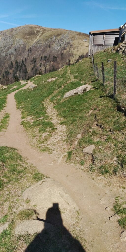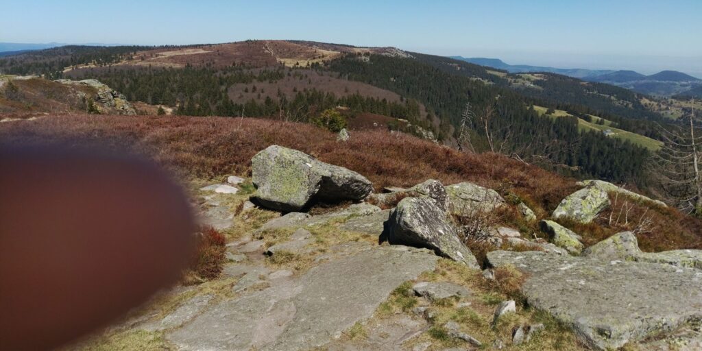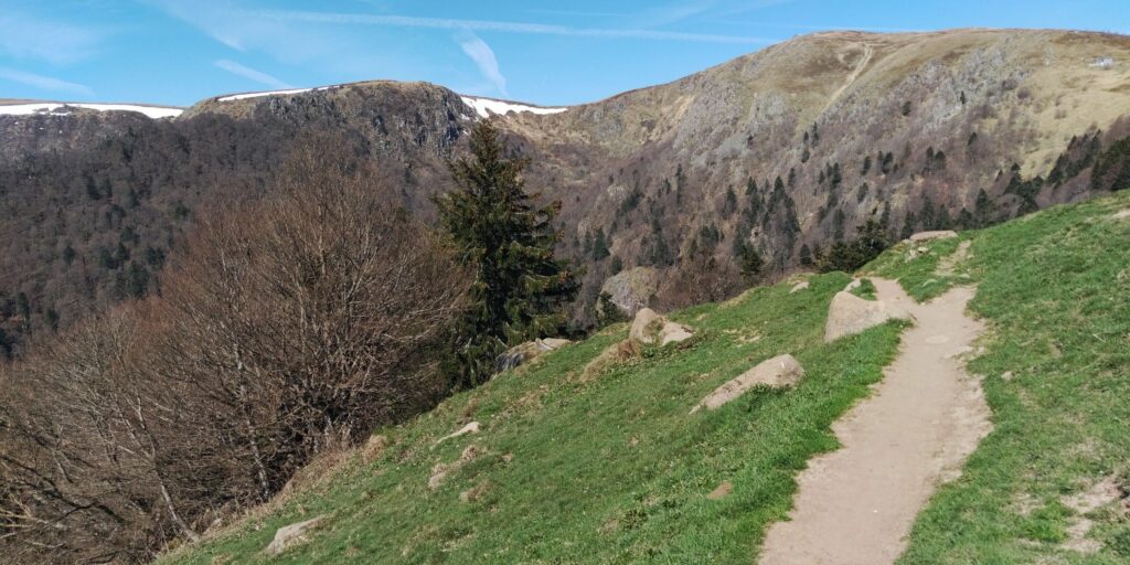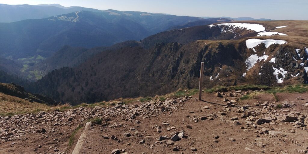 Erstmal ging es im gleichen Stil wie gestern mit Grenzsteinen und steinigem Weg weiter. Auf der Zwischenebene von Trois Fours sah ich dann den Hohneck liegen, ganz schön Respekt einflößend, besonders auch die Martinswand, fast senkrecht. Zum Glück ging der GR5 nicht direkt an der Kante längs.