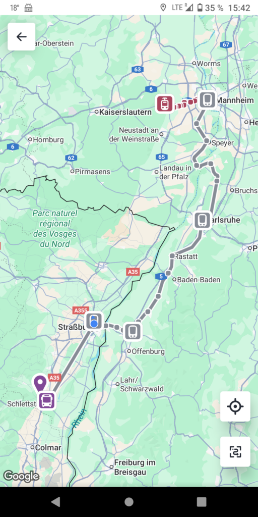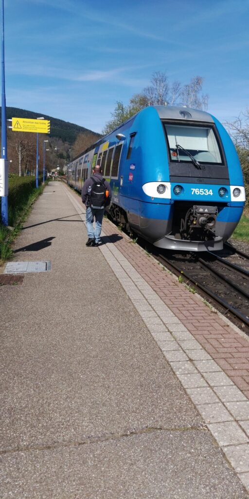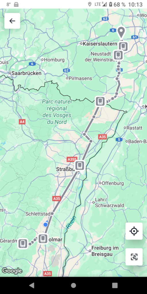 In Straßburg habe ich reichlich Zeit zum Umsteigen, genieße zwischendurch die Sonne auf dem Bahnhofsvorplatz. Die französischen Züge und der Bus waren alle sehr pünktlich, hatten auch immer genug Puffer zum Aus-/Einsteigen. Dagegen kommt der deutsche Zug in Wissembourg erst nach seiner vorgesehenen Wiederabfahrtszeit an. Da ist der Anschlusszug nach Straßburg längst weg…