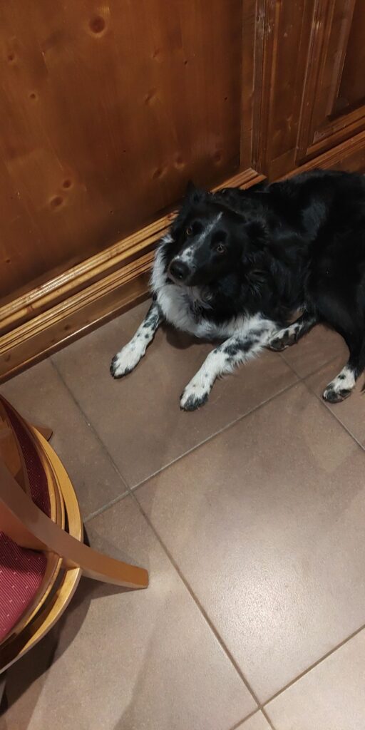 Um 16:30 komme ich an. Ein netter Border Collie begrüßt mich, der mir auch beim Frühstück Gesellschaft leisten wird, obwohl ich seiner Aufforderung zum Ballspiel nicht nachkomme…