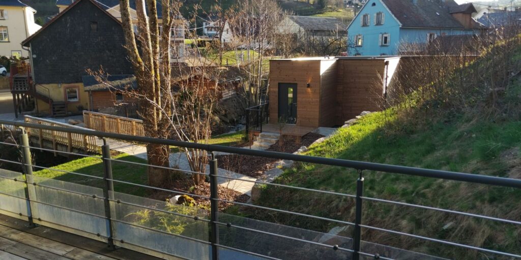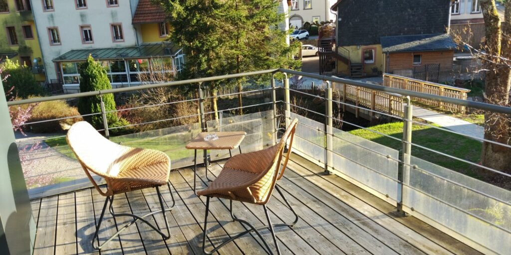 Um kurz nach vier bin ich am Hôtel de la Poste. Das Zimmer befindet sich nicht im Haupthaus direkt an der Straße sondern – wie auch die Sauna – in einer Holzhütte im Garten. Der Balkon ist riesig.