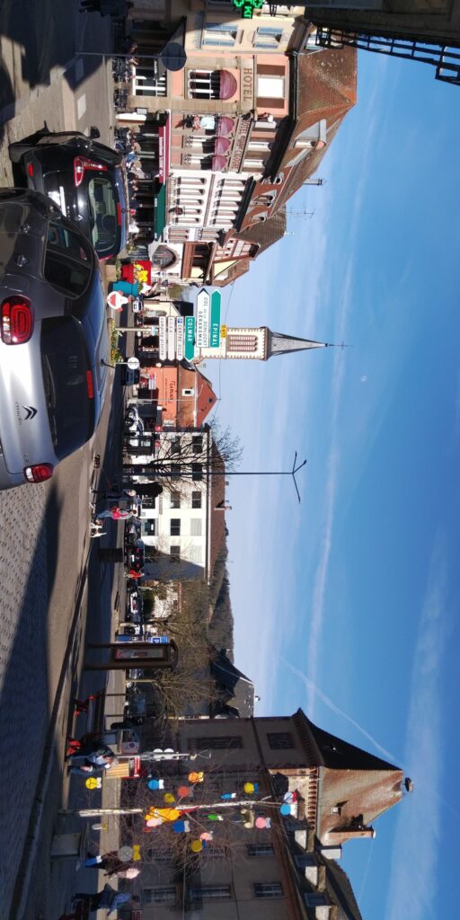 Von 8 bis 9 war ich der einzige Frühstücksgast. Zum Bahnhof sind es nur 10 Minuten zu Fuß. Es gibt viel Storchengeklapper und Hin- und Herfliegerei. Auch auf den Wiesen sind viele unterwegs. Die Berge werden langsam weniger spektakulär, schließlich kommen Weinstöcke ins Bild. Vor dem Bahnhof Colmar wirkt das frische Grün sehr freundlich.